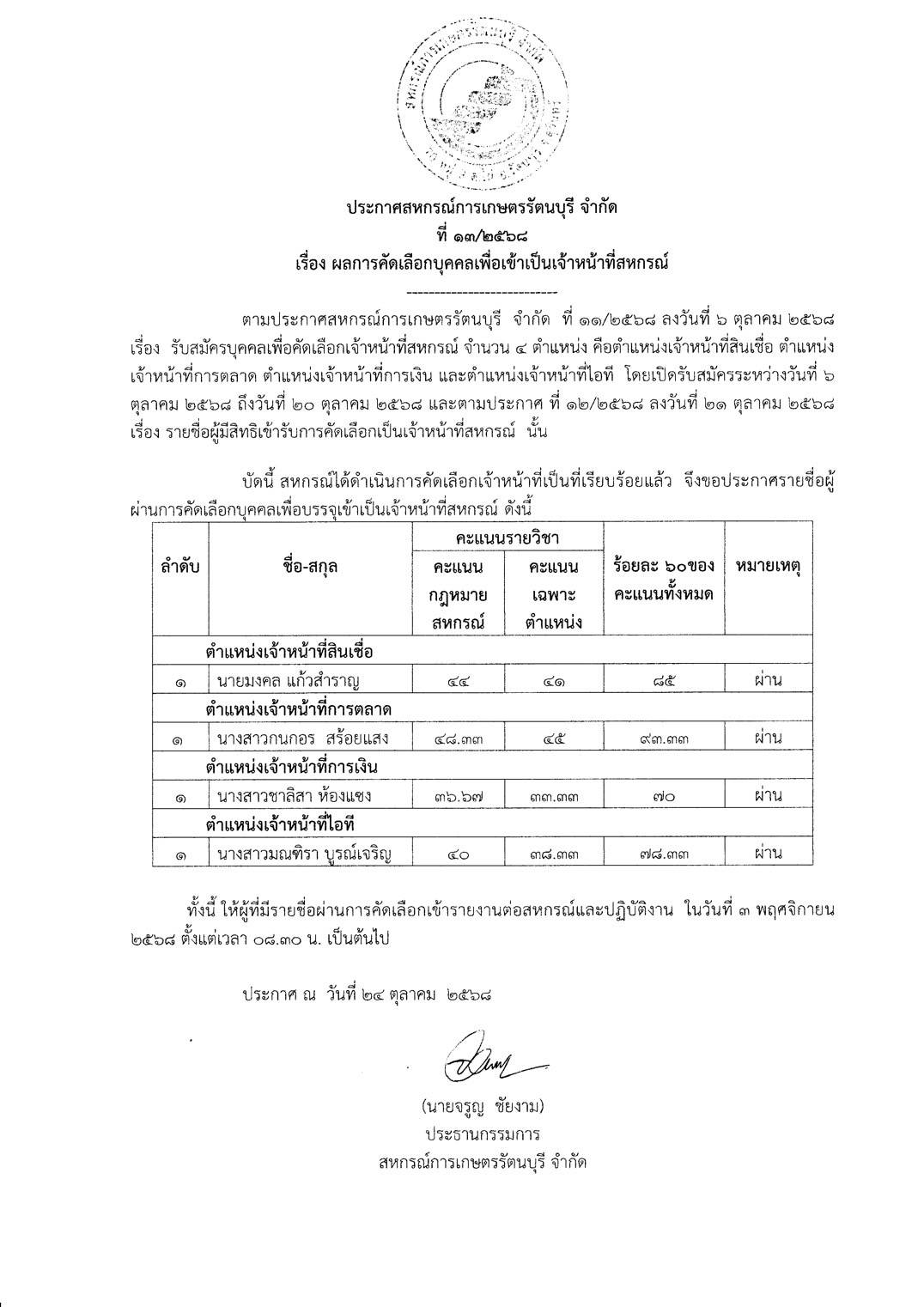 ประกาศผลการคัดเลือกบุคคลเพื่อเข้าเป็นเจ้าหน้าที่สหกรณ์